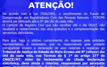 A Associação dos Notários e Registradores do Estado de Mato Grosso (Anoreg-MT) informa que os registradores civis das pessoas naturais têm até o dia 5 de julho para efetuarem o recolhimento do Fundo de Compensação. O Cartório …