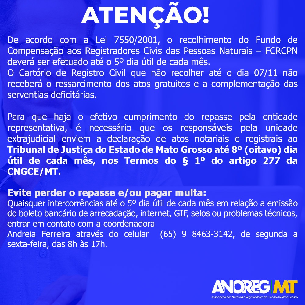 A Associação dos Notários e Registradores do Estado de Mato Grosso (Anoreg-MT) informa que os registradores civis das pessoas naturais têm até o dia 7 de novembro para efetuarem o recolhimento do Fundo de Compensação. O Cartório de Registro Civil que não recolher até a data indicada não receberá o ressarcimento dos atos gratuitos e a complementação das serventias deficitárias.