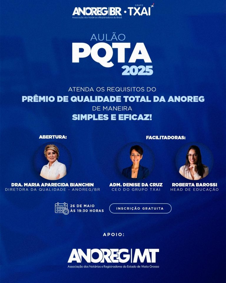 A Associação dos Notários e Registradores do Estado de Mato Grosso (Anoreg-MT) informa qua a Anoreg-BR e o Grupo TXAI realizarão, no dia 26 de maio, às 19h30 (horário de Brasília), o Aulão PQTA 2025. O evento será promovido com o objetivo de orientar de forma simples e eficaz os cartórios sobre os requisitos e critérios do Prêmio de Qualidade Total da Anoreg (PQTA).